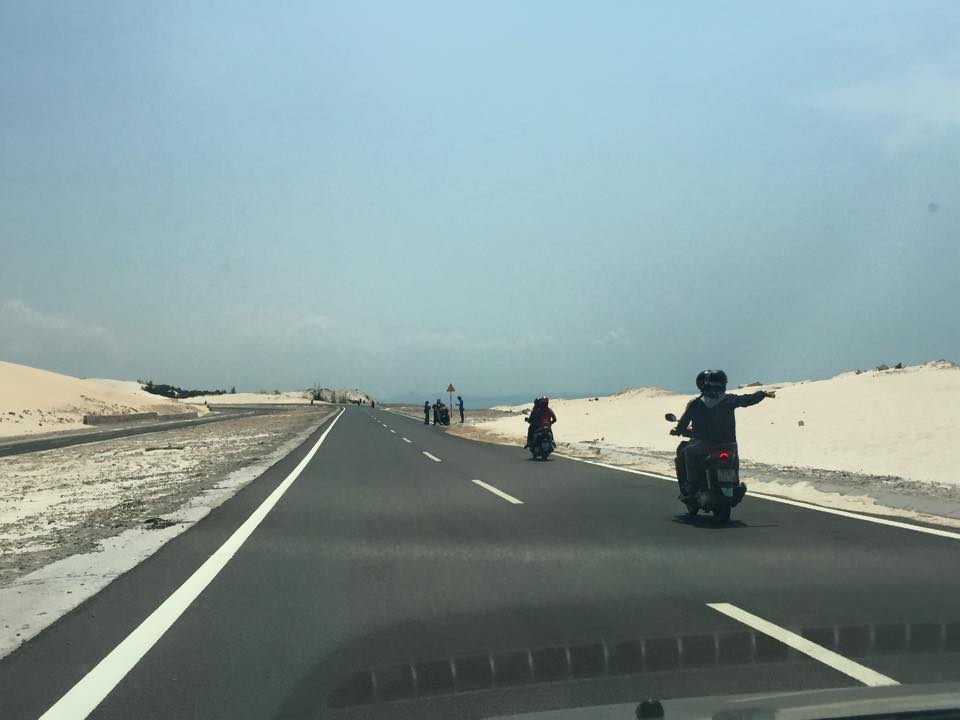 Đến Phan Thiết, đi về hướng Mũi Né, theo cung ven biển TL716 nhằm hướng Phan Rang thẳng tiến. Khởi từ Mũi Né-Bàu Trắng-Phan Rí, đoạn này tuyệt đẹp. Đường mới rộng rãi phẳng lì, ít xe chạy, hai bên là những cánh rừng tràm mùa đông bắt đầu trụi lá, nhiều loại hoa dại khoe sắc, bờ biển cát trắng yên bình. Có những đoạn như ngang qua "hoang mạc" với tầm nhìn ngút mắt. Đến Phan Rí (qua sông Luỹ, nên nhờ bác Google map) rẽ ra QL1A chạy về hướng Phan Rang. Nếu thích, bạn có thể dừng chân ghé thăm nhà vườn thanh long, trang trại nho ở đoạn này, hoặc chụp ảnh hoa bằng lăng nở tím các sườn đồi ngay bên đường (tháng 8), làng gốm Bàu Trúc...Chúng tôi chạy thẳng ra đảo Bình Hưng (60km từ Phan Rang). Đây là một trong những điểm chính, nên đến.